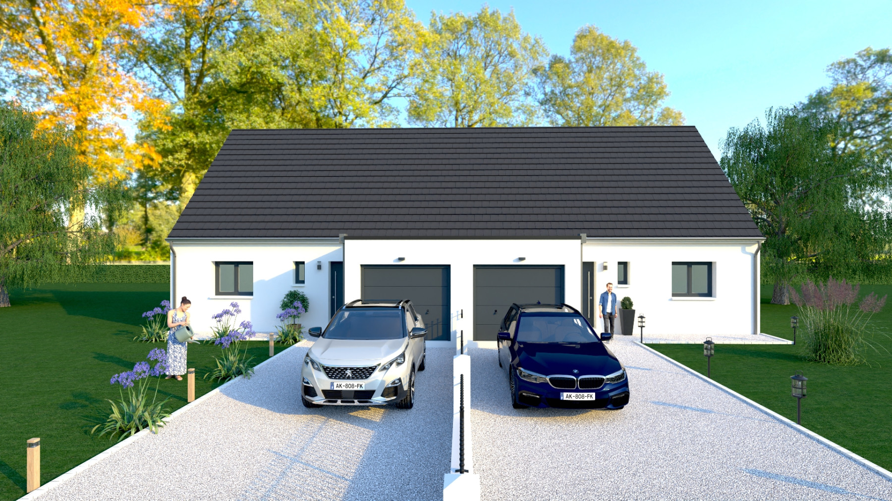 Double locatif, de 80 m² environ par maison, avec toiture 2 pans sur la construction principale et toit plat sur l'avancée des garages intégrés.