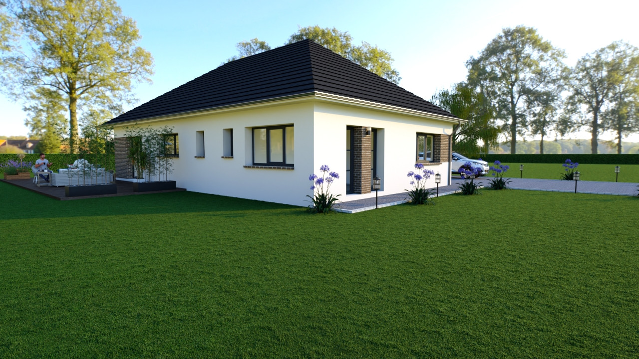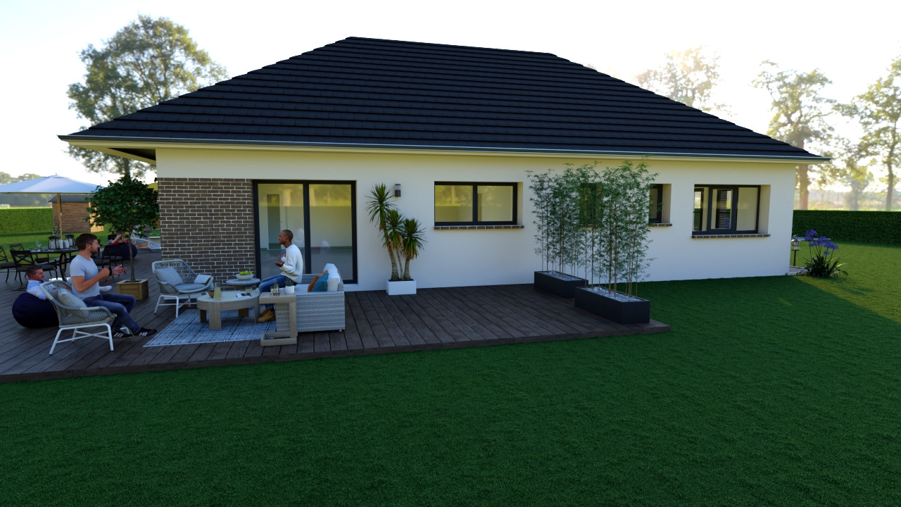 Ce projet d'environ 130 m² est un plain-pied avec garage en enduit gratté, habillé par endroit de briquettes entre les trumeaux, dans le fond de porche et sur les appuis de fenêtres. Sa toiture 4 pans est couverte de tuiles plates coloris ardoisé.
